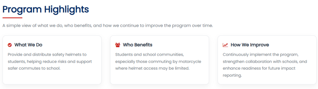 The “Helmet for Students” initiative was launched under the vision to contribute to local communities and society through regionally rooted business activities, while promoting group-wide social contribution initiatives. Inspired by daily observations of motorcycle accidents and students commuting without helmets, the program has been continuously implemented since 2025 to help prevent injuries and promote road safety in our communities.